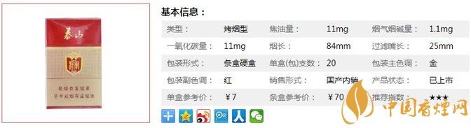 泰山红将军采用全新茶甜香技术,融合泰山品牌全新茶甜香增香保润技术,茶香精华随烟气缓慢释放,有效净化吸食口感,全面降低口腔及喉部刺激感。下面我们一起来看泰山红将军的参数信息:焦油量:11mg. 烟碱量:1.1mg. 一氧化碳量:11mg.