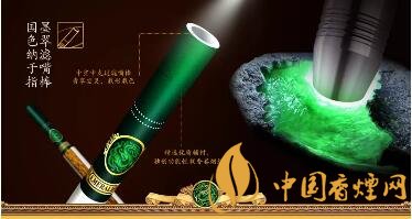 取出烟支,碧玉通透,上有祥云状龙腾图标和金色翡翠字样,近烟端为金色“EMERALD”字母和回形纹环绕,辅之于中空中支过滤嘴棒及独创功能性载香卷烟纸,集外观与功能于一身。