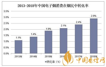 据统计,2018年中国电子烟消费在烟民中转化率(新型烟草消费者占烟民比例)约为2.9%。