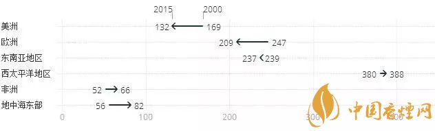 按世界卫生组织所划分地域的2015年与2000年吸烟人数变化对比: