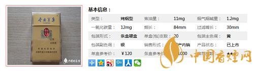 | 类型 :烤烟型 | 焦油量 :11mg | 烟气烟碱量 :1.2mg | 一氧化碳量 :12mg |