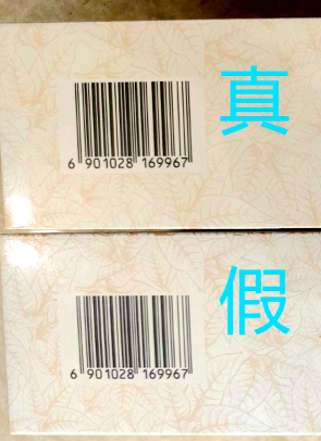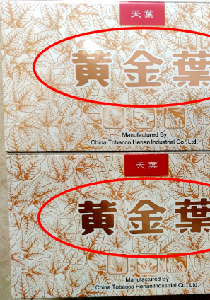 1.看条盒正面商标纸印刷:真烟商标纸采用胶印印刷,“黄金葉”三个字采用压凸烫金工艺,字体笔画饱满清晰且较粗,底纹透明度好,图案清晰,层次感强;假烟采用高清扫描仿制印刷,“黄金葉”三个字笔画较细且边缘较粗糙,底纹极不清晰。