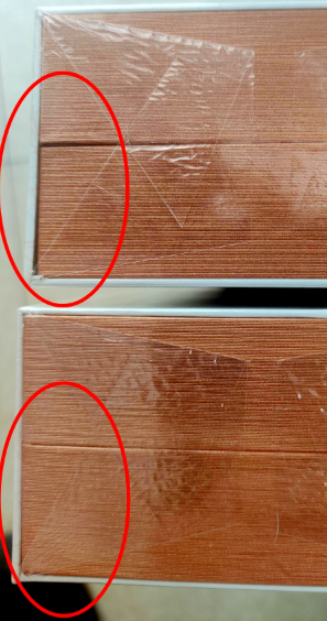 4.看条盒端面封口:真烟端面封口一般都是手工包装,经常有斜形刷痕,包装紧凑,封口严实;假烟一般无斜形刷痕,包装较为松散,封口不严。