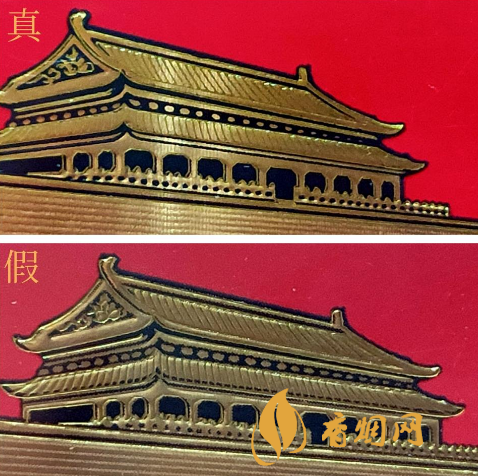 真烟的原产地标志为蓝色椭圆形,折光可见“中华”字样、8颗“★”及天安门图案,色彩饱满,图案清晰。而假烟色彩暗淡,图案模糊。
