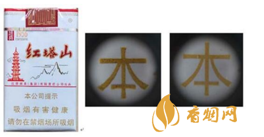 假冒香烟:通常采用胶印印刷,两种颜色交界边缘无锯齿痕迹。“1956”字体笔画粗细不均匀,无立体感,红塔图案模糊。