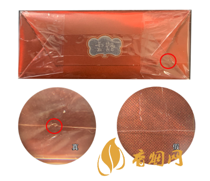 小盒底部塑料纸对比:真烟底部塑料纸切口处有明显断点;假烟切口处平滑无断点。
