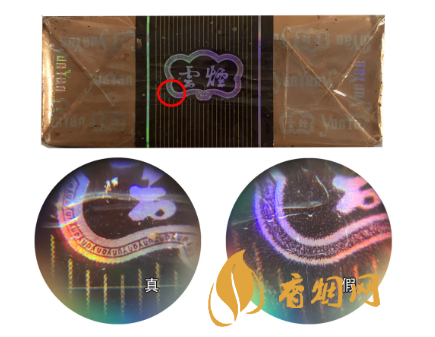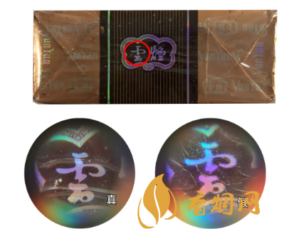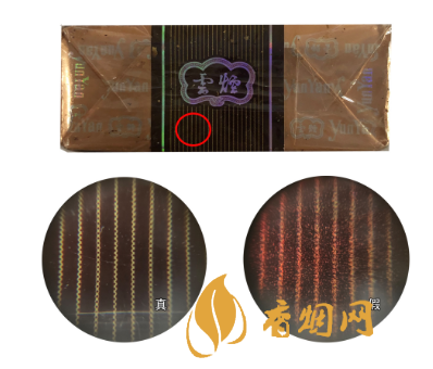 小盒顶端封签图案印刷工艺对比一:真烟“云烟”图案印刷清晰,边缘光滑;假烟“云烟”图案线条边缘为锯齿状。