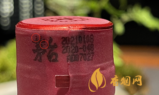 喷码位于瓶盖一侧,由“茅台”字样及三行数字组成,需要特别注意的是“茅”字草字头下方和“台”字中间有一个黑色小圆点。茅台酒“茅台”中的“茅”字的草字头的左边一竖的顶端有一缺口。