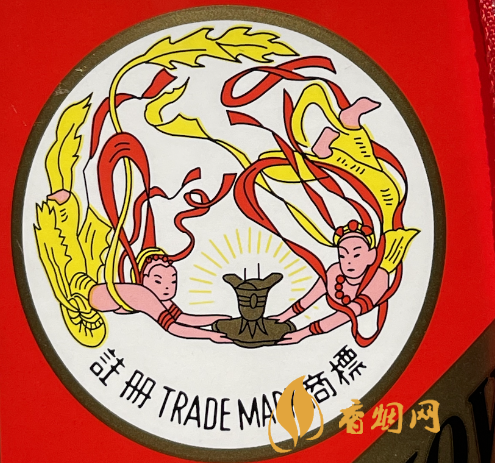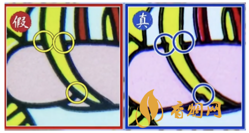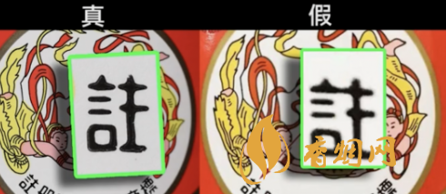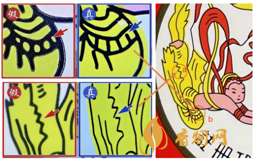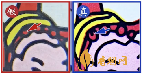 真:飞天标右上角仙女红色飘带会有一个小折角,红色飘带是贯通的;