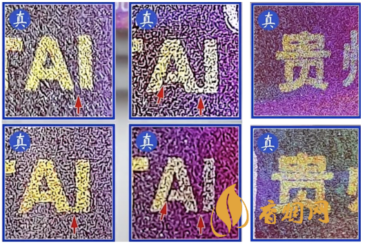 标识在不同角度呈现不同色彩效果,“茅台”二字中间有“MT”暗记,放大60倍可明显看到。