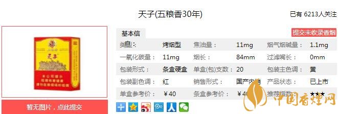 天子五粮香30年包装盒正中间是稻谷、小麦、玉米、高粱、大豆的图案,也就是所谓的内含五粮香珠的“五粮”,香烟吸味上纯粹五粮香,口感甘甜、味道醇厚,深受广大烟民的喜欢。经香烟网小编市场调查天子五粮香30年售价为40元/包。