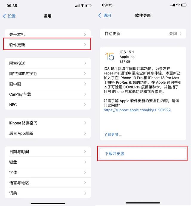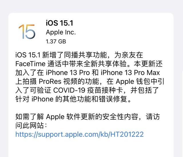 根据苹果官方的更新日志介绍,iOS 15.1正式版新增了同播共享功能,为亲友在FaceTime通话中带来全新共享体验;加入了在iPhone13 Pro和iPhone13 Pro Max上拍摄ProRes视频的功能;Apple钱包中引入了可验证COVID-19疫苗接种卡,并针对iPhone的其它功能和错误进行了修复。更新页面显示,从上个正式版本更新,所需下载的安装包在 1.37G 左右(不同机型略有差异),如图所示。