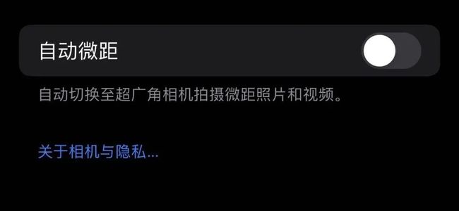 而在iOS15.1中新增了可关闭自动微距切换功能。当关闭自动微距功能时,相机就不会自动切换到超广角相机拍摄微距照片和视频了。