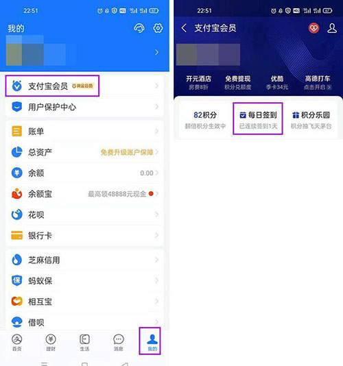 今年的万能卡名为万能福卡,万能福卡可以转化成任意一张五福福卡,所以有了万能福卡,就相当于有了敬业福。久叔发现,在一个很隐秘的位置,有大概率获得万能福卡的机会,那就是支付宝的积分签到处。点击支付宝【我的】-【支付宝会员】-【每日签到】。