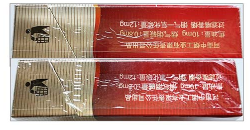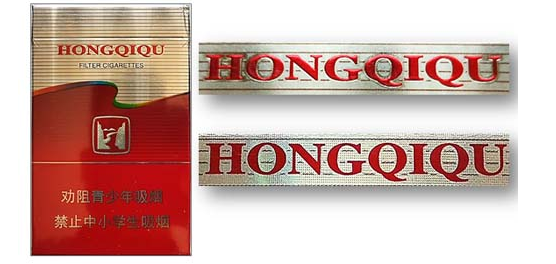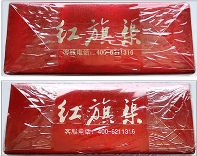 真品卷烟:“红旗渠”图案,金色烫金金属质感强;整体图案凹凸处理,立体感强;“水纹”底纹图案清晰、完整、均匀,图案完美。