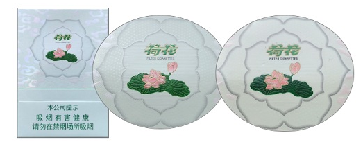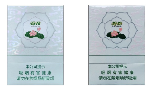 假冒卷烟:该款假冒卷烟外侧花瓣无银色亮点;黑色边缘线颜色重,无凸起白色轮廓线;荷花字体烫金漏烫;荷花花瓣粉红色无过渡色,花芯图案糊在一起。