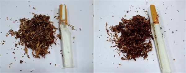 通过整体的烟丝结构差异对比:真品烟丝均是从醇化好的“红花大金元”烟叶中手工甄选出千分之一,成为“云烟(大重九)”的主原料,从源头到工艺的“四级调香”体系,形成了独具特色的津甜香,切丝宽度均匀一致且无其他杂质;假烟从原料到烟丝结构均无法达到真品烟丝成色及掺配比例,假烟烟丝杂质较多,与真品烟丝结构存在明显差异。(左真右假)